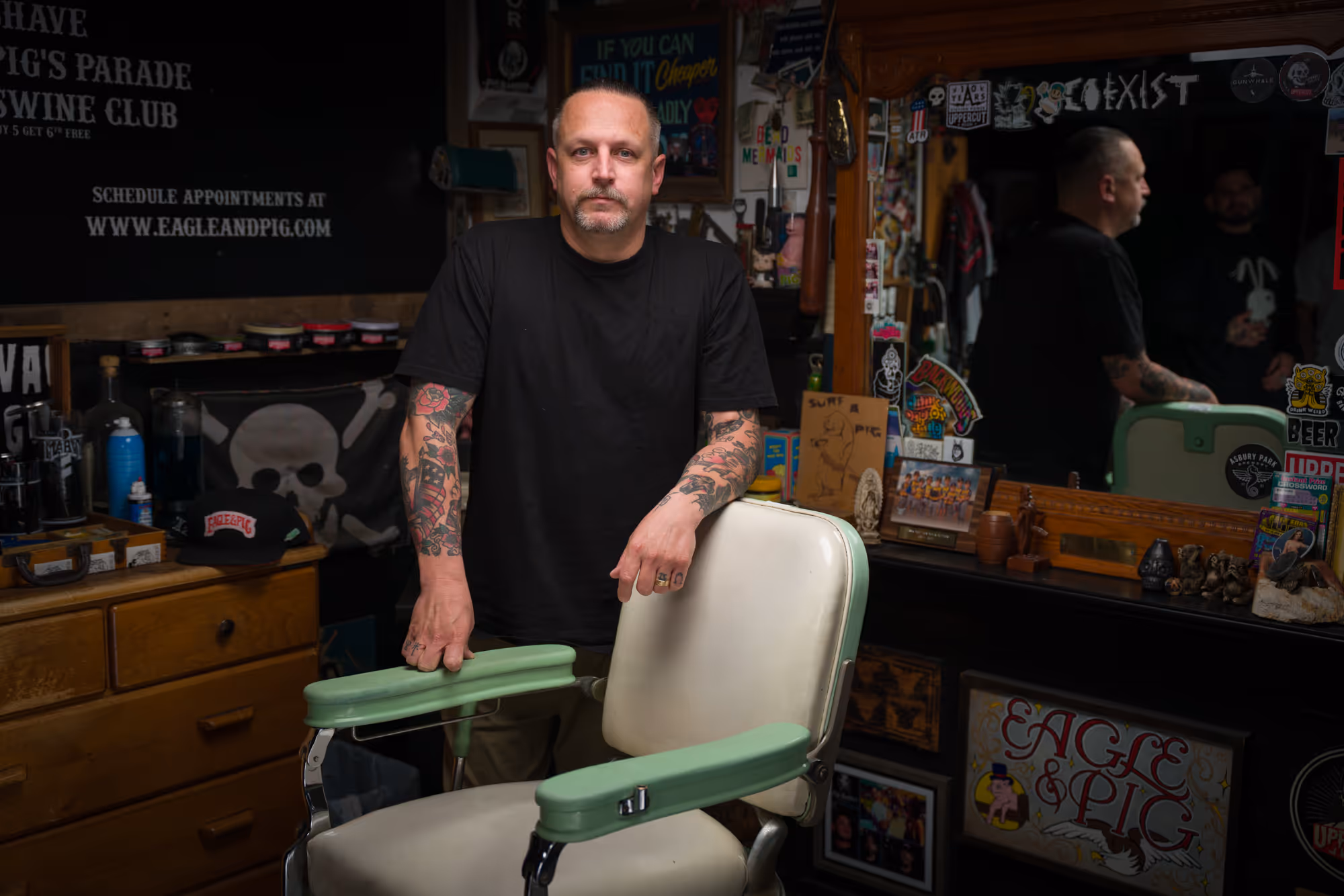 Dane Hesse, head barber and founder of Eagle & Pig, brought his passion for unique experiences to Costa Mesa after college. Following his training at Real Barber’s College, Dane opened Eagle & Pig in 2011, creating a shop that reflects his love for old cars, tattoos, motorcycles, and good whiskey. More than just great haircuts, Eagle & Pig offers an unforgettable experience—stop by for the cut, stay for the vibe.